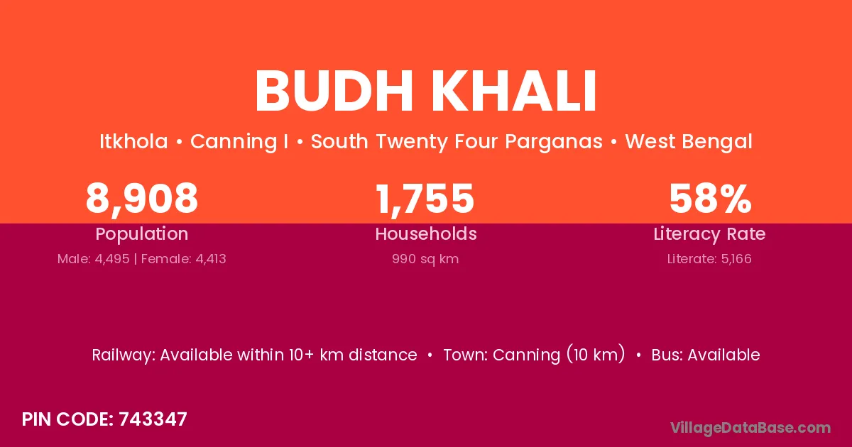Canning (10 km) is the nearest town to Budh Khali village for major economic activities and is located approximately 10 km away.