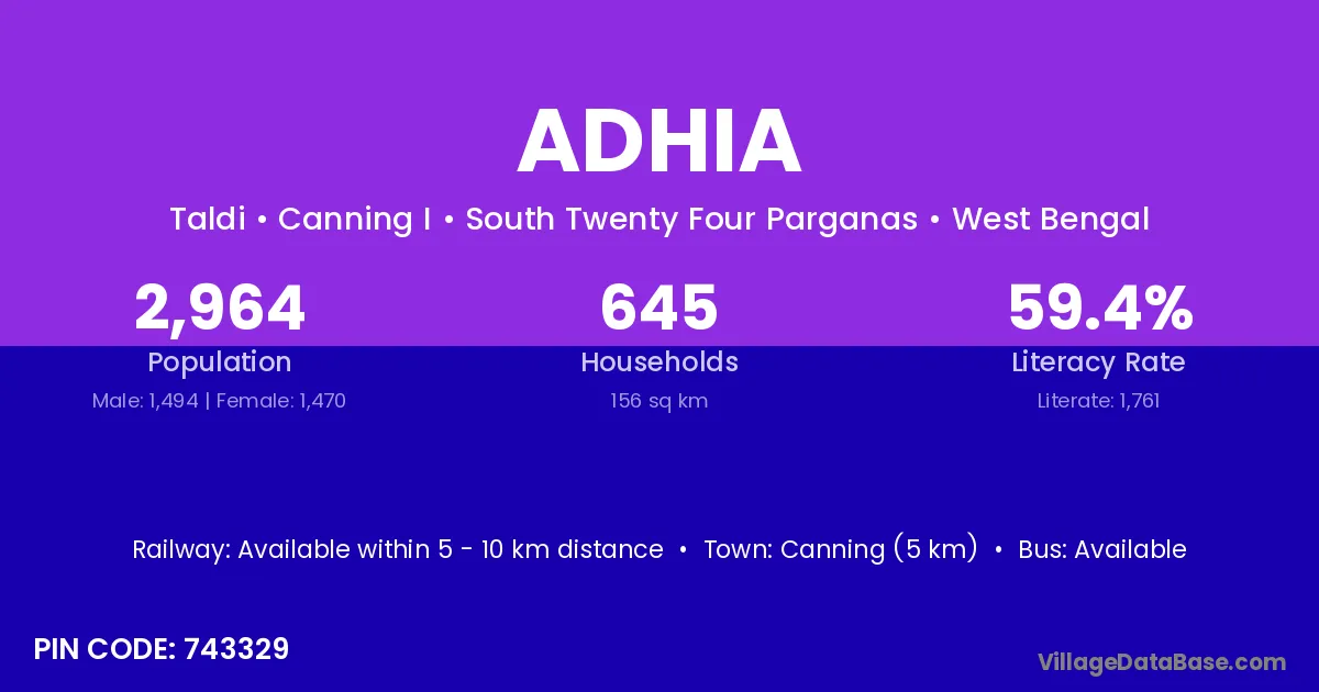 Canning (5 km) is the nearest town to Adhia village for major economic activities and is located approximately 5 km away.