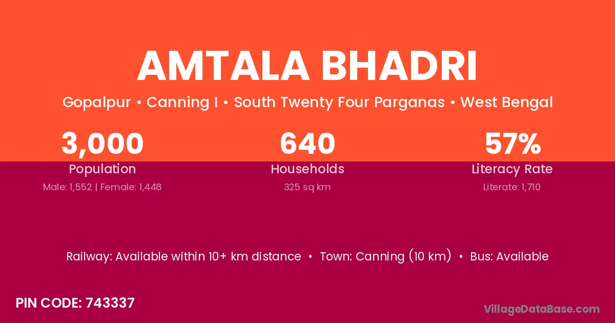 Canning (10 km) is the nearest town to Amtala Bhadri village for major economic activities and is located approximately 10 km away.