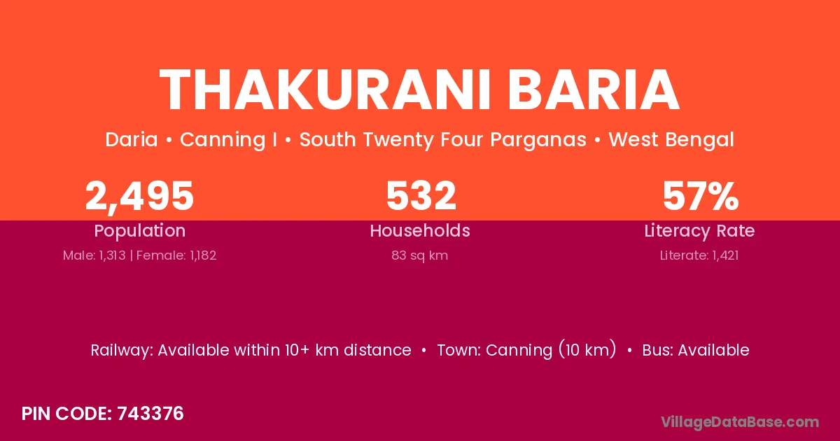 Canning (10 km) is the nearest town to Thakurani Baria village for major economic activities and is located approximately 10 km away.