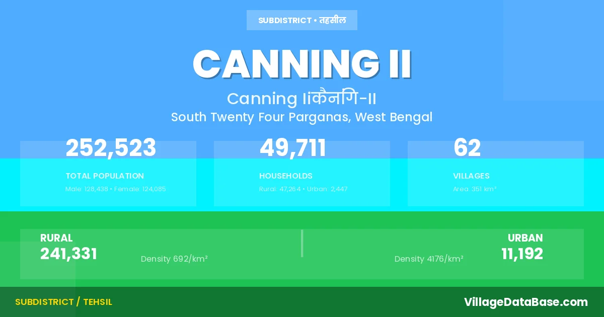Canning II is a town and Subdivision in the South Twenty Four Parganas district of the West Bengal. In India, a Subdivision is a subdivision of a district responsible for the administration and revenue collection of a specific area within the district. Subdivisions play a crucial role in the local governance structure, contributing significantly to the development and administration of their communities.
