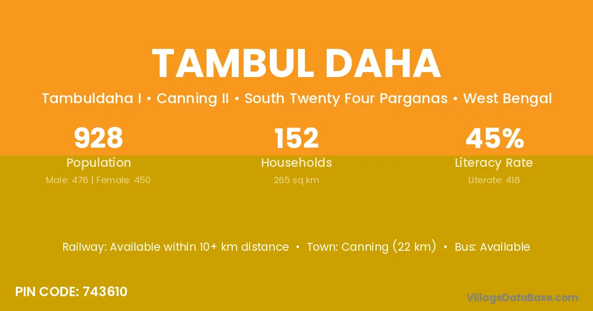 Canning (22 km) is the nearest town to Tambul Daha village for major economic activities and is located approximately 22 km away.