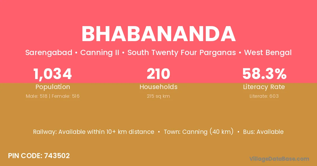Canning (40 km) is the nearest town to Bhabananda village for major economic activities and is located approximately 40 km away.