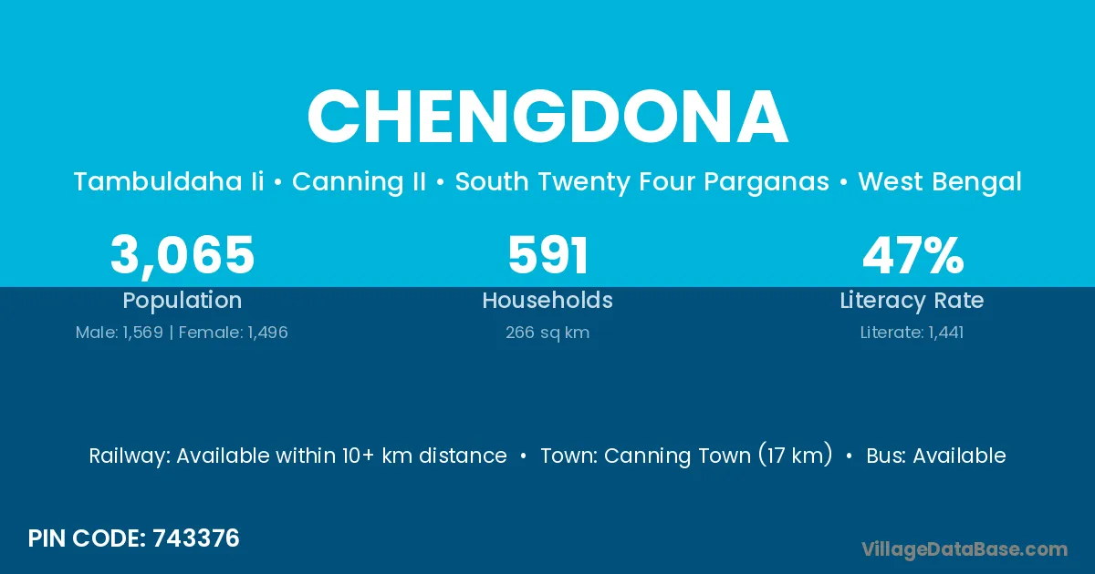 Chengdona village is located in the Canning II Subdivision of the South Twenty Four Parganas district in West Bengal.