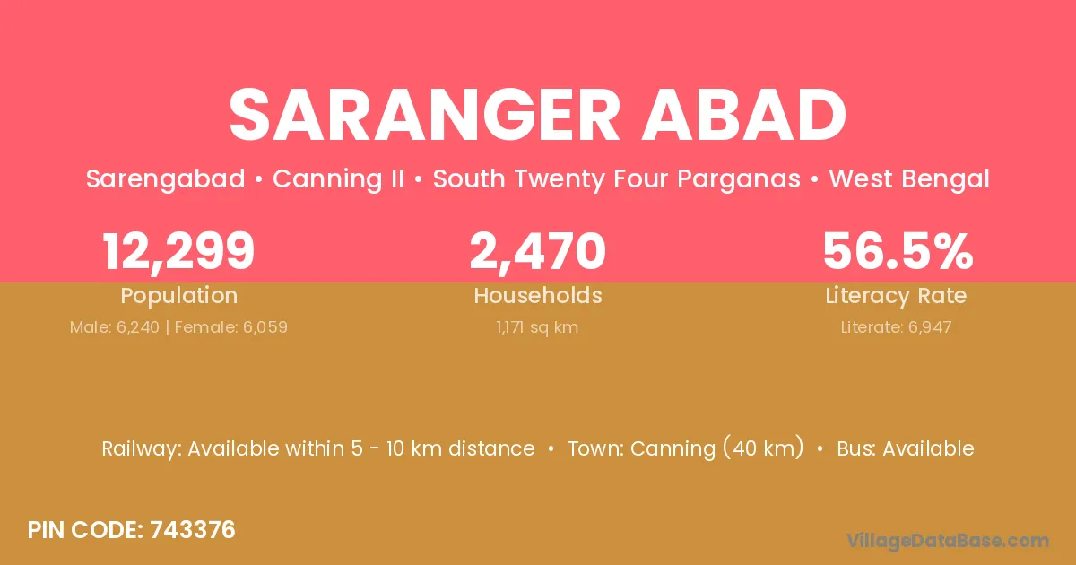 Canning (40 km) is the nearest town to Saranger Abad village for major economic activities and is located approximately 40 km away.
