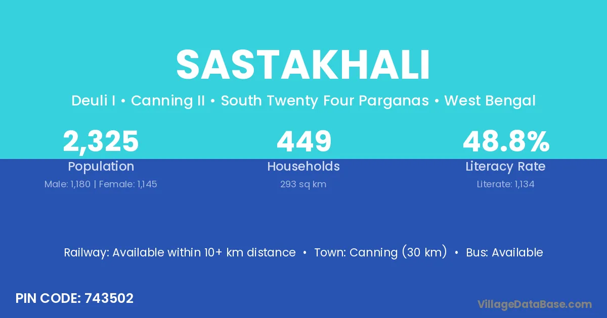 Canning (30 km) is the nearest town to Sastakhali village for major economic activities and is located approximately 30 km away.