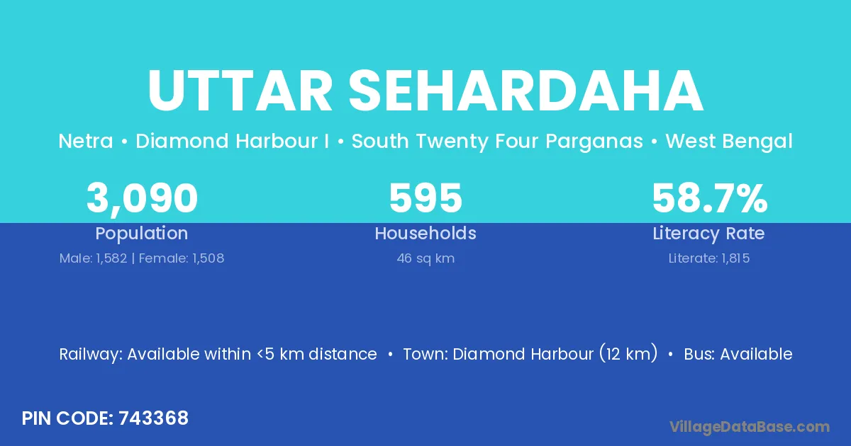 Diamond Harbour (12 km) is the nearest town to Uttar Sehardaha village for major economic activities and is located approximately 12 km away.