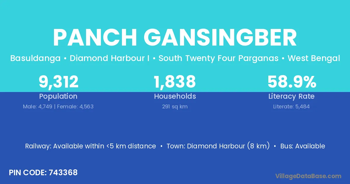 Diamond Harbour (8 km) is the nearest town to Panch Gansingber village for major economic activities and is located approximately 8 km away.