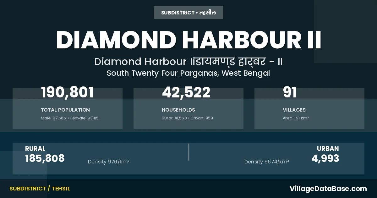 According to the 2011 census The total area of Diamond Harbour II Subdivision is 191 km², with a population of 190801 people. The population density is 997 inhabitants per square kilometre, and there are approximately 42522 houses in the sub district.
