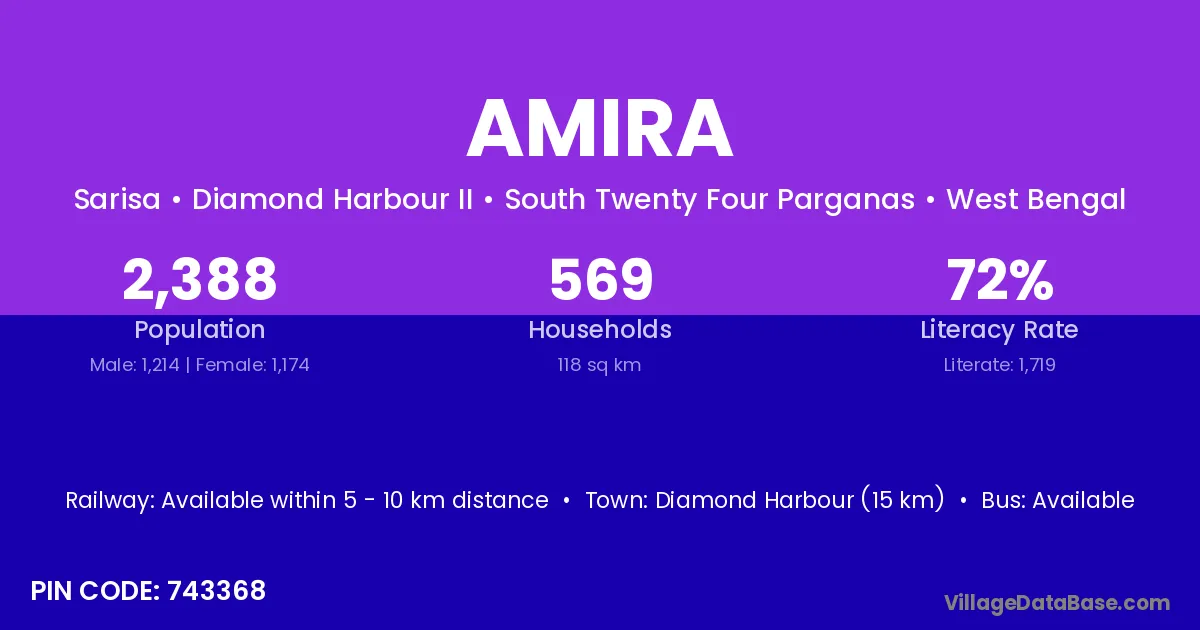 Diamond Harbour (15 km) is the nearest town to Amira village for major economic activities and is located approximately 15 km away.