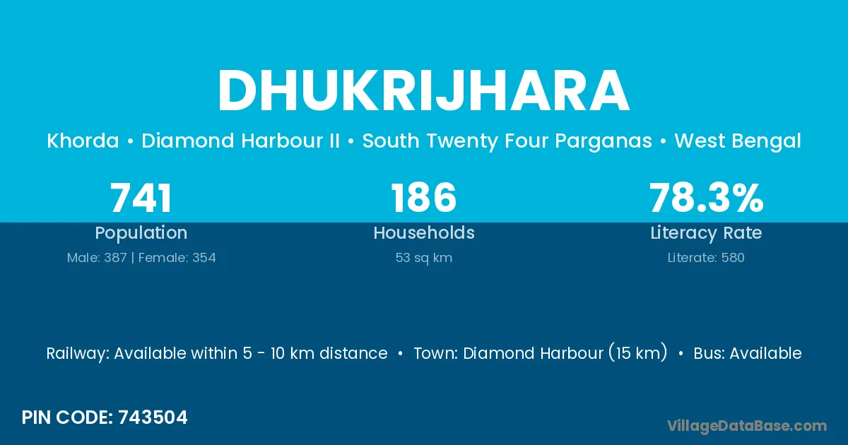 Diamond Harbour (15 km) is the nearest town to Dhukrijhara village for major economic activities and is located approximately 15 km away.