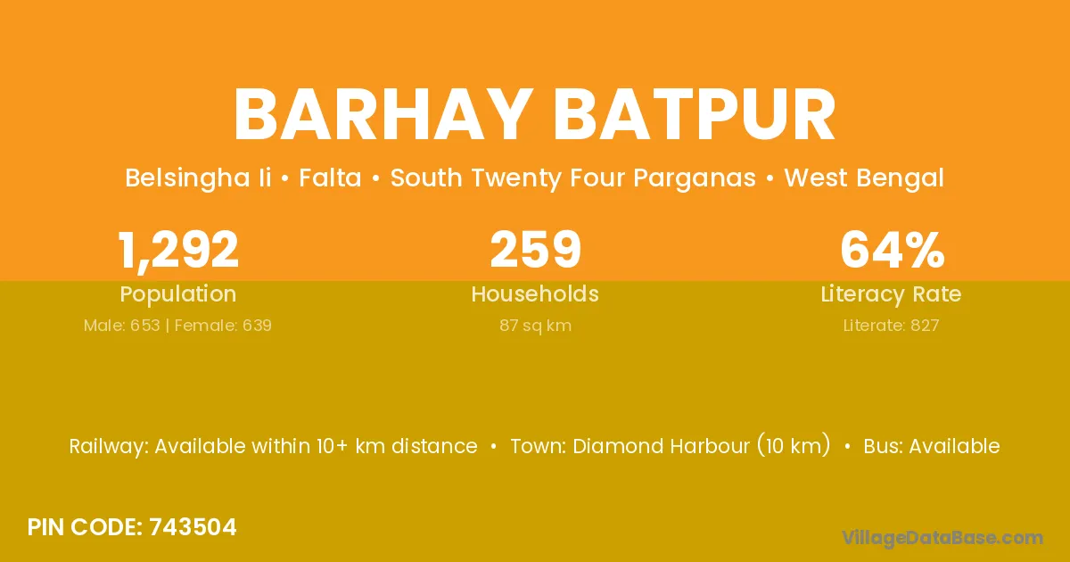 Diamond Harbour (10 km) is the nearest town to Barhay Batpur village for major economic activities and is located approximately 10 km away.