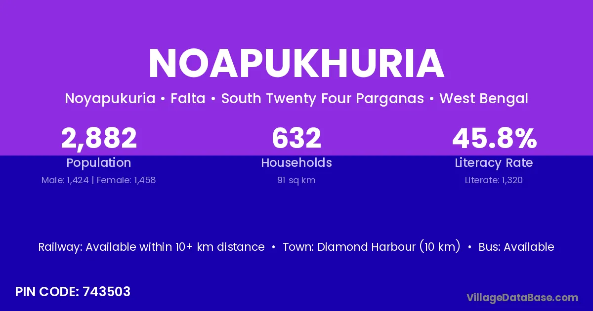 Diamond Harbour (10 km) is the nearest town to Noapukhuria village for major economic activities and is located approximately 10 km away.