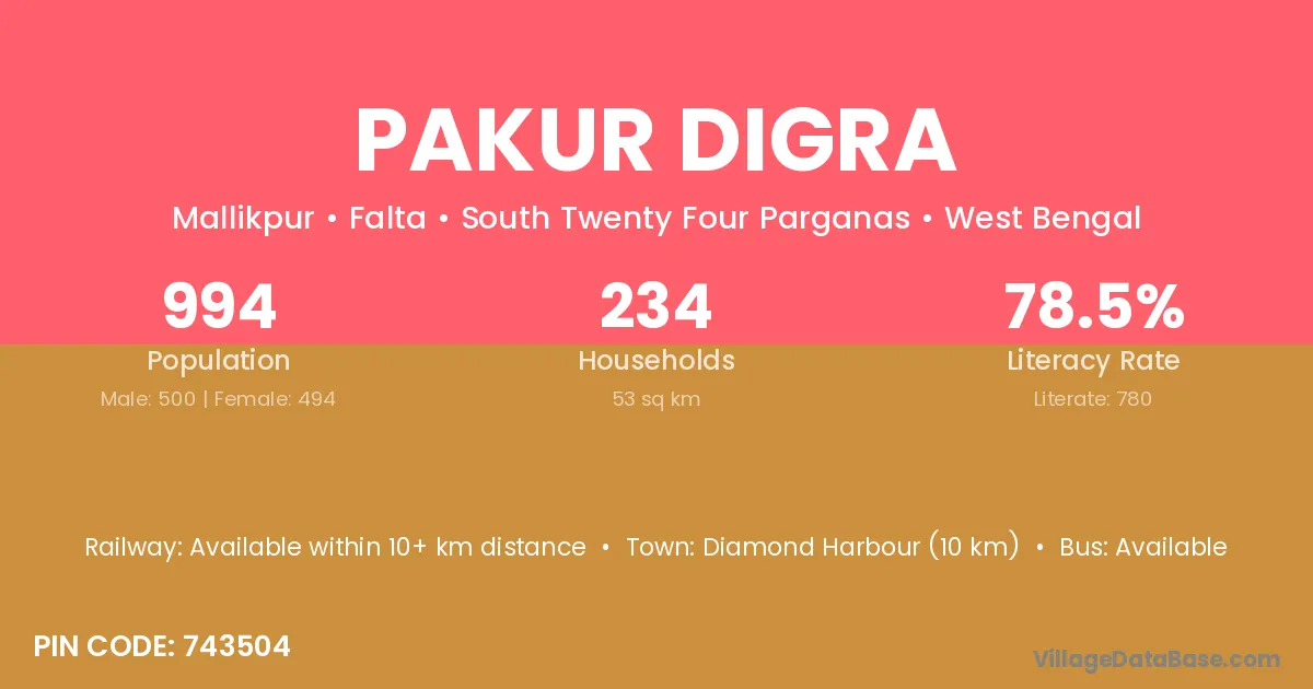 Diamond Harbour (10 km) is the nearest town to Pakur Digra village for major economic activities and is located approximately 10 km away.