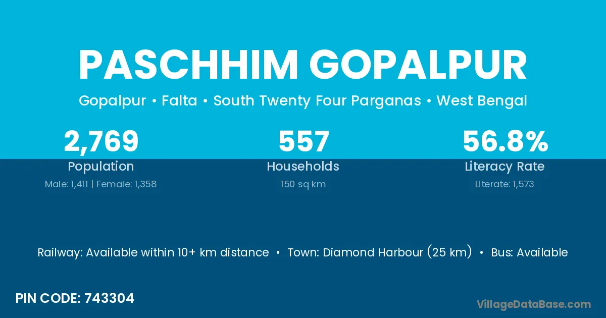Diamond Harbour (25 km) is the nearest town to Paschhim Gopalpur village for major economic activities and is located approximately 25 km away.