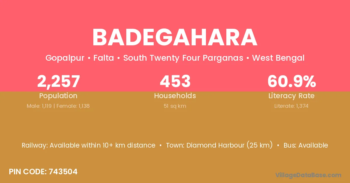 Diamond Harbour (25 km) is the nearest town to Badegahara village for major economic activities and is located approximately 25 km away.