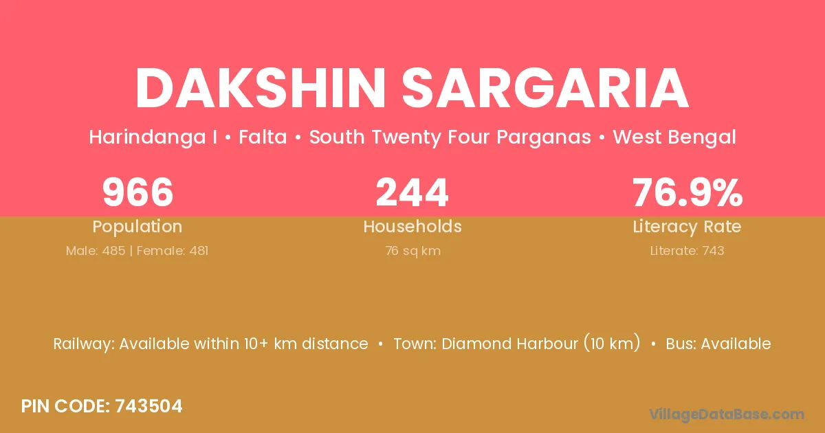 Diamond Harbour (10 km) is the nearest town to Dakshin Sargaria village for major economic activities and is located approximately 10 km away.