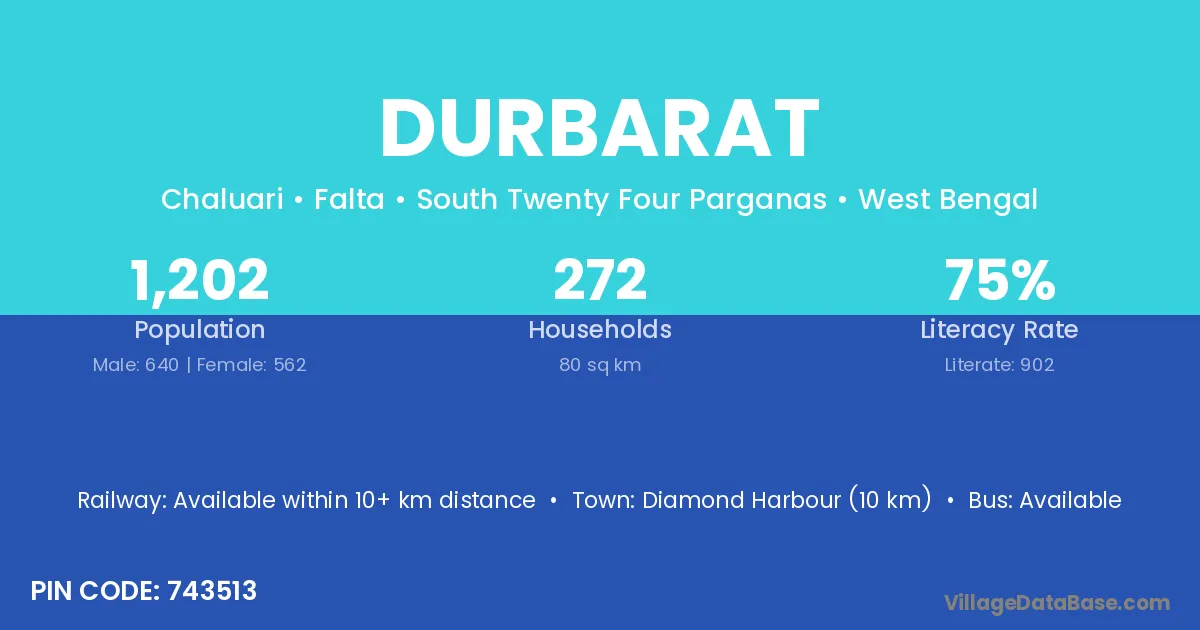 Diamond Harbour (10 km) is the nearest town to Durbarat village for major economic activities and is located approximately 10 km away.