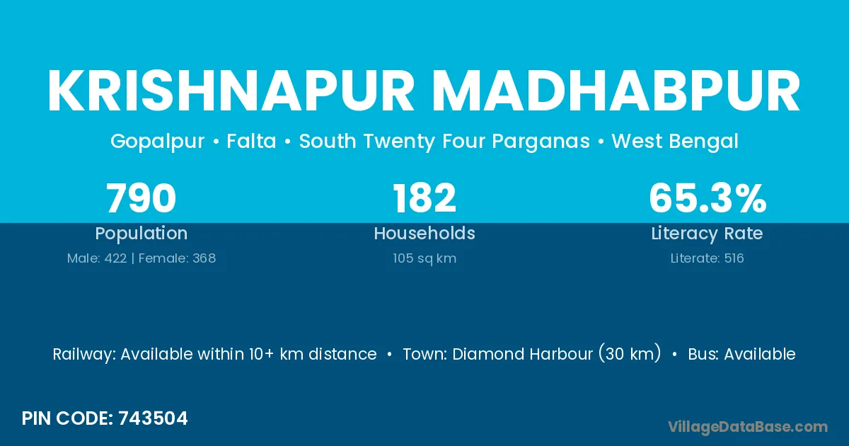 Diamond Harbour (30 km) is the nearest town to Krishnapur Madhabpur village for major economic activities and is located approximately 30 km away.