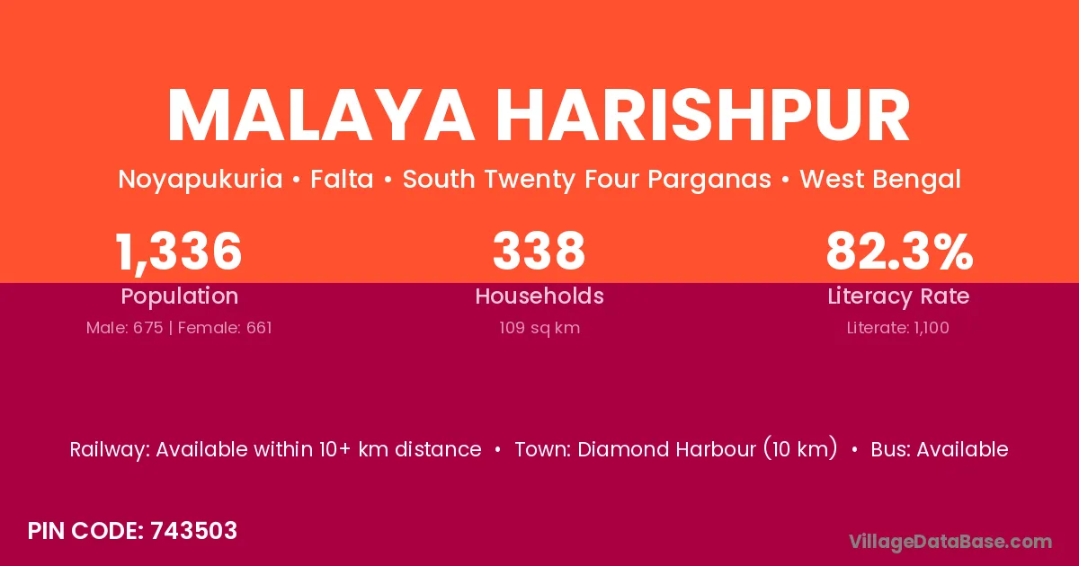 Diamond Harbour (10 km) is the nearest town to Malaya Harishpur village for major economic activities and is located approximately 10 km away.