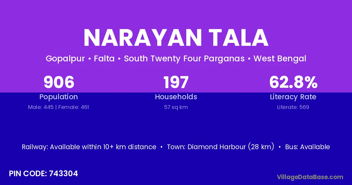 Diamond Harbour (28 km) is the nearest town to Narayan Tala village for major economic activities and is located approximately 28 km away.