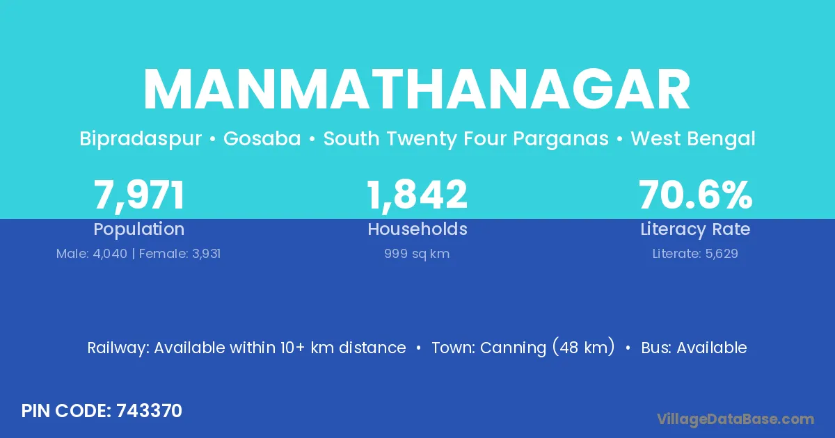 Canning (48 km) is the nearest town to Manmathanagar village for major economic activities and is located approximately 48 km away.