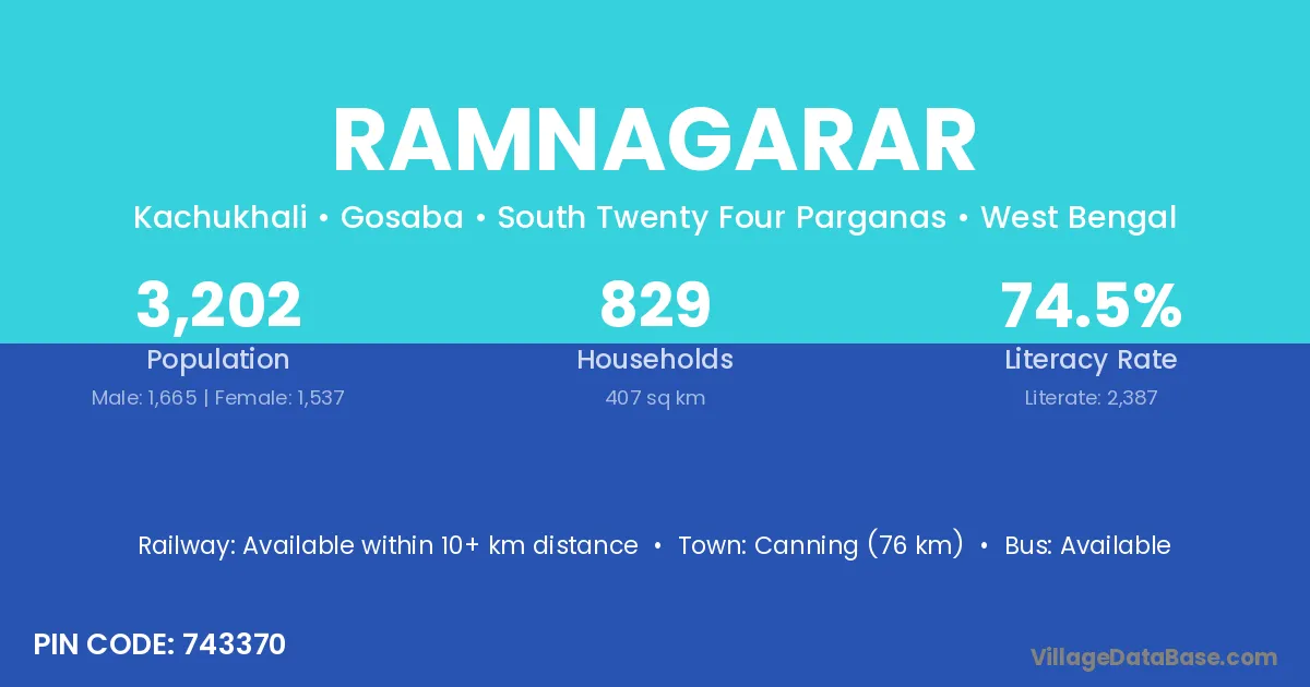 Canning (76 km) is the nearest town to Ramnagarar village for major economic activities and is located approximately 76 km away.