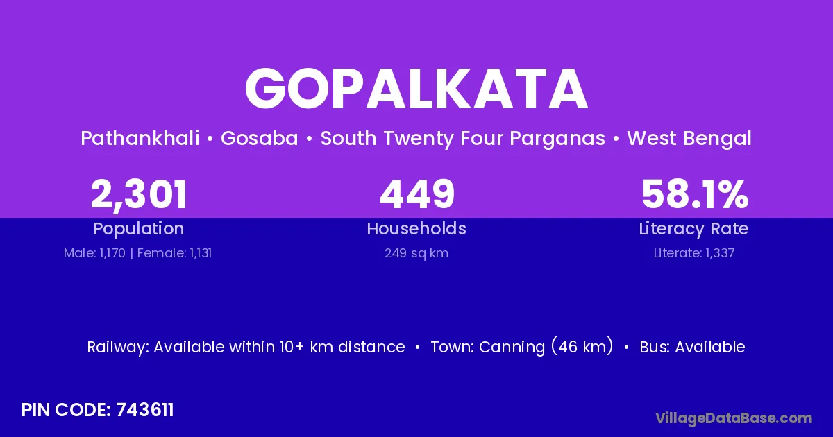 Canning (46 km) is the nearest town to Gopalkata village for major economic activities and is located approximately 46 km away.