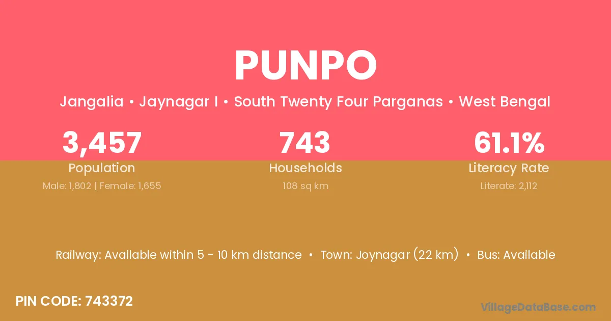 Joynagar (22 km) is the nearest town to Punpo village for major economic activities and is located approximately 22 km away.