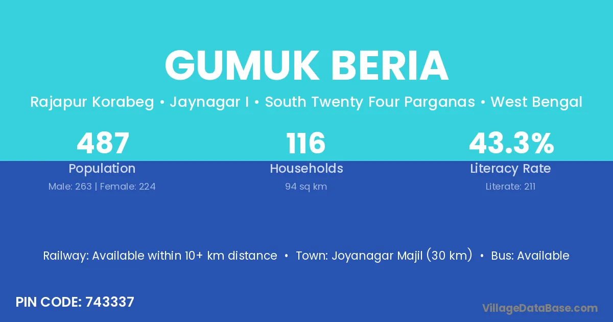 Gumuk Beria village is located in the Jaynagar I Subdivision of the South Twenty Four Parganas district in West Bengal .