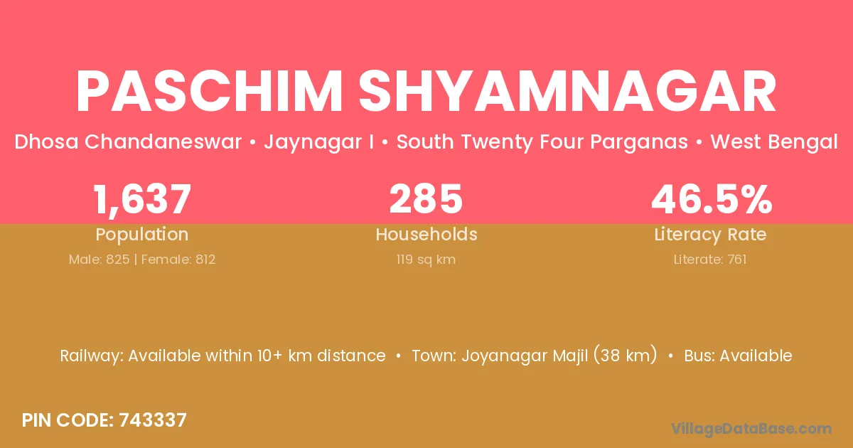Joyanagar Majil (38 km) is the nearest town to Paschim Shyamnagar village for major economic activities and is located approximately 38 km away.