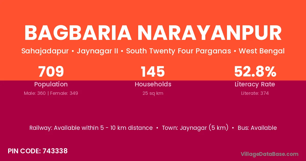 Jaynagar (5 km) is the nearest town to Bagbaria Narayanpur village for major economic activities and is located approximately 5 km away.