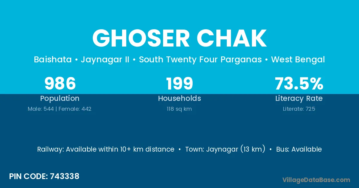Jaynagar (13 km) is the nearest town to Ghoser Chak village for major economic activities and is located approximately 13 km away.