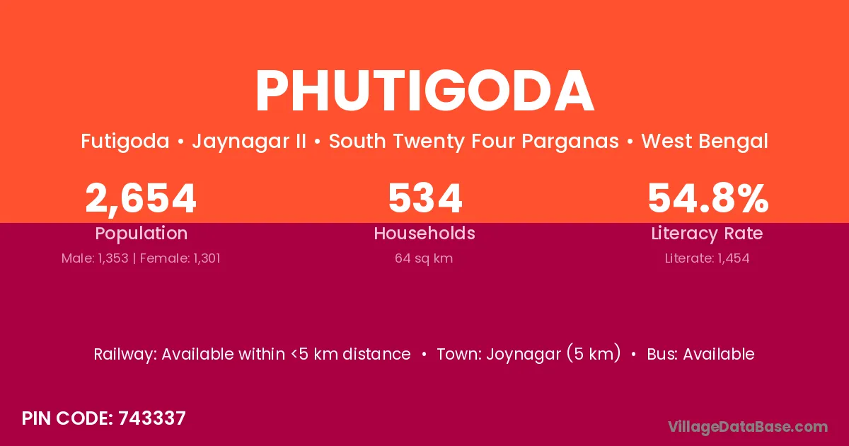 Phutigoda village is located in the Jaynagar II Subdivision of the South Twenty Four Parganas district in West Bengal.