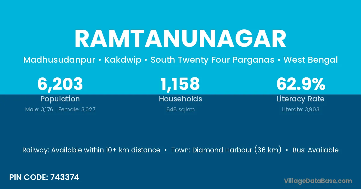 Diamond Harbour (36 km) is the nearest town to Ramtanunagar village for major economic activities and is located approximately 36 km away.