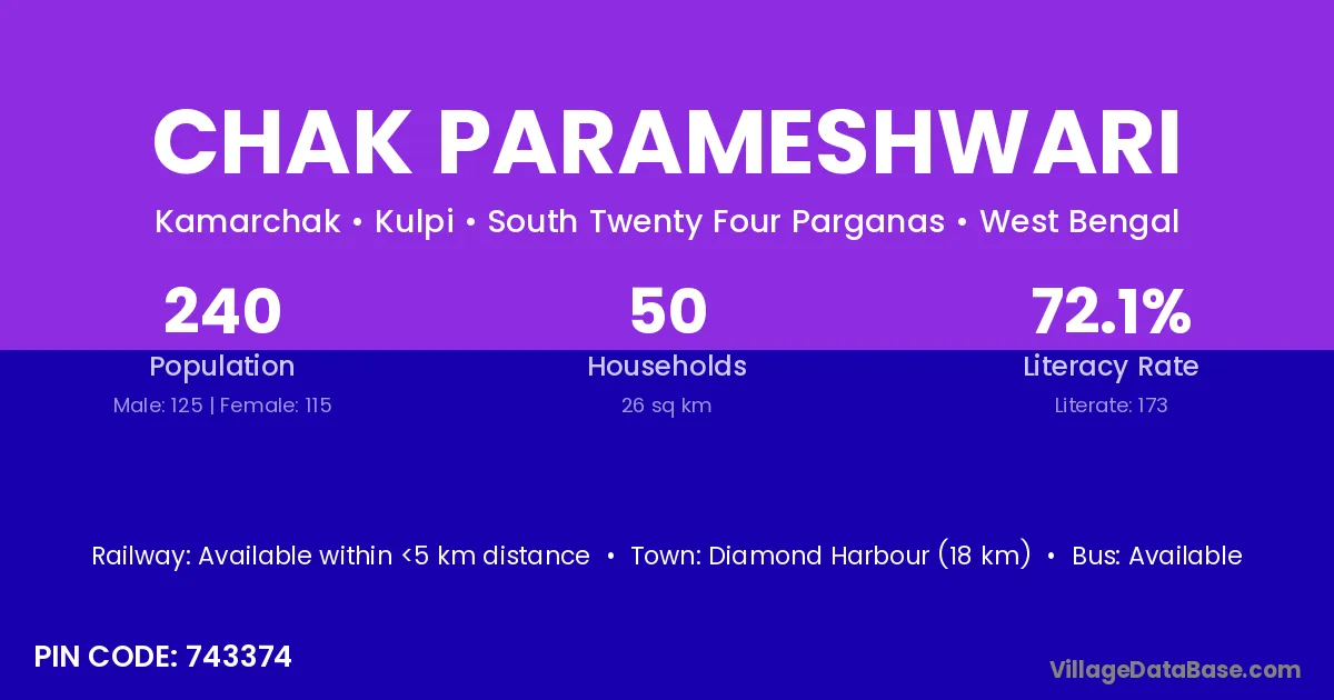 Chak Parameshwari village is located in the Kulpi Subdivision of the South Twenty Four Parganas district in West Bengal.