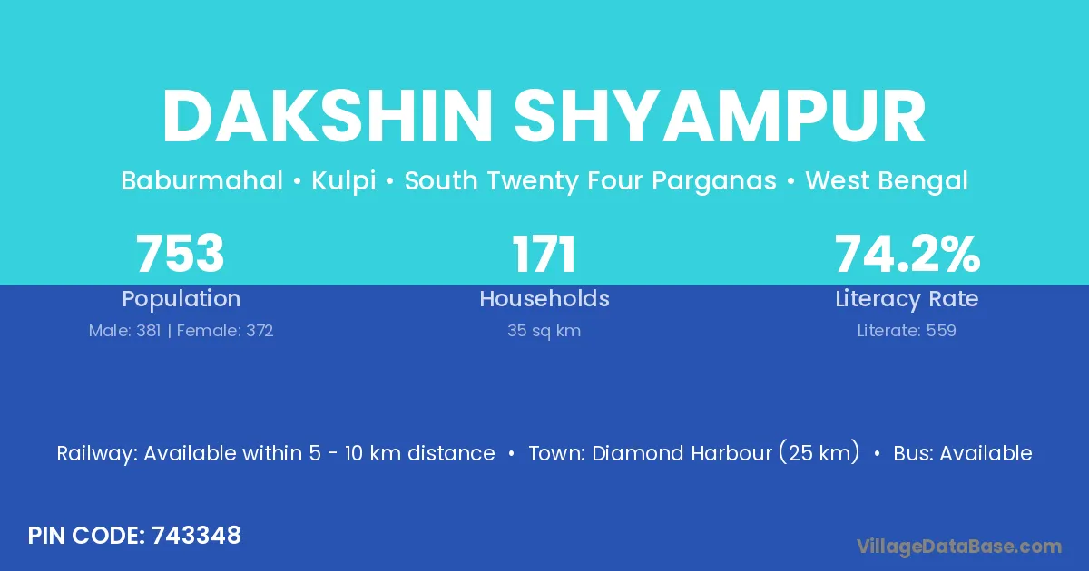 Dakshin Shyampur village has a total population of 753 people, of which 381 are males and 372 are females.
