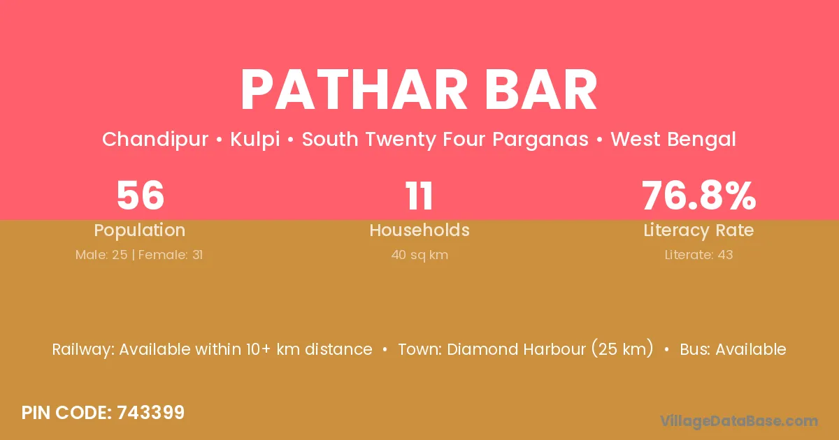 Diamond Harbour (25 km) is the nearest town to Pathar Bar village for major economic activities and is located approximately 25 km away.