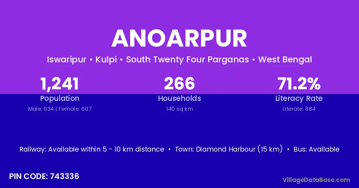 Diamond Harbour (15 km) is the nearest town to Anoarpur village for major economic activities and is located approximately 15 km away.
