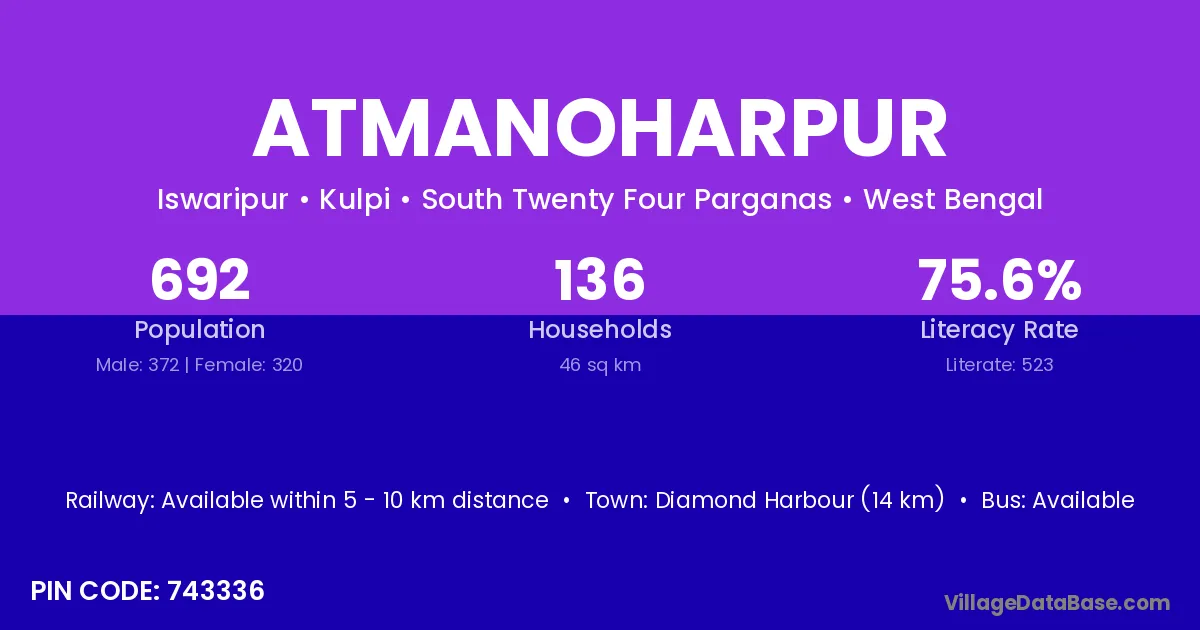 Diamond Harbour (14 km) is the nearest town to Atmanoharpur village for major economic activities and is located approximately 14 km away.