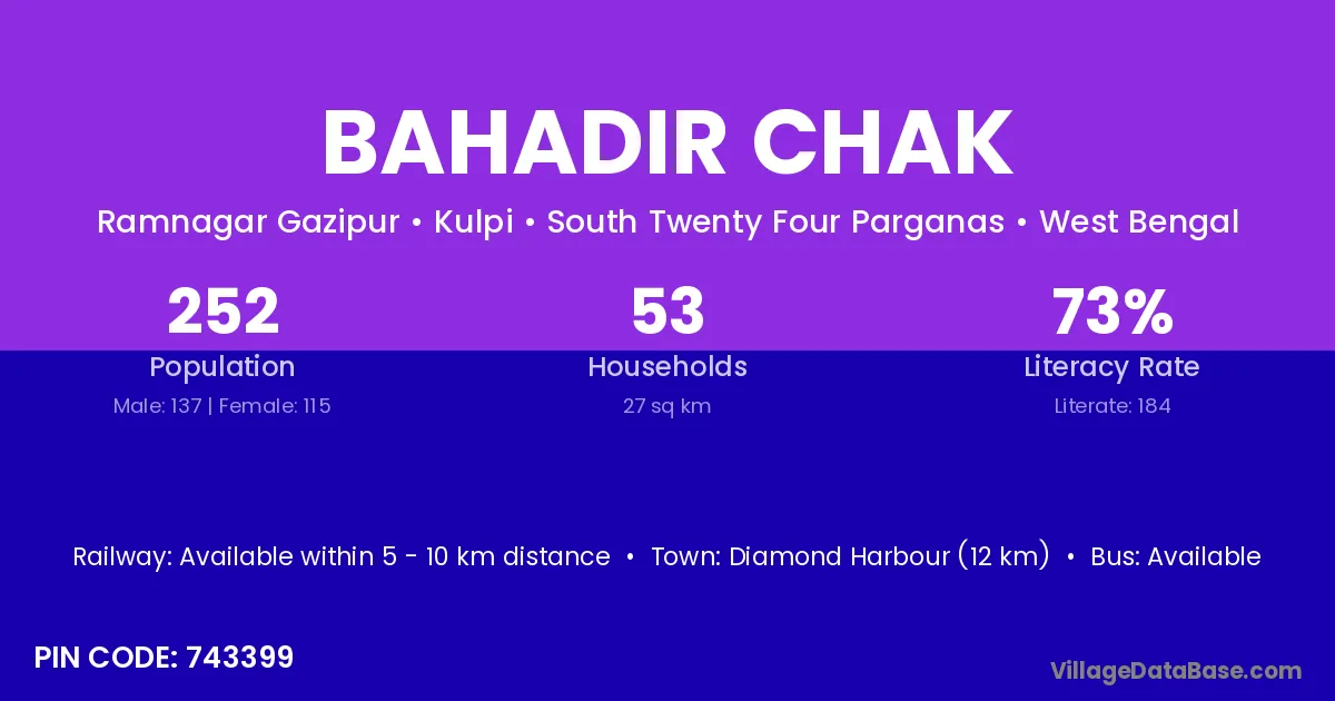 Diamond Harbour (12 km) is the nearest town to Bahadir Chak village for major economic activities and is located approximately 12 km away.