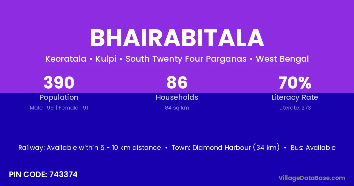 Diamond Harbour (34 km) is the nearest town to Bhairabitala village for major economic activities and is located approximately 34 km away.