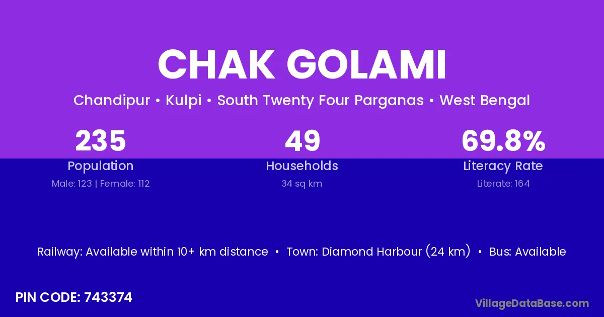 Diamond Harbour (24 km) is the nearest town to Chak Golami village for major economic activities and is located approximately 24 km away.