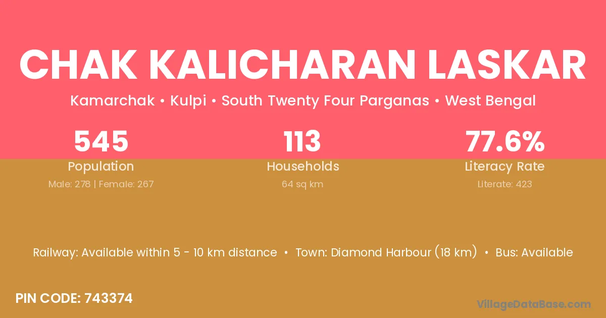 Diamond Harbour (18 km) is the nearest town to Chak Kalicharan Laskar village for major economic activities and is located approximately 18 km away.