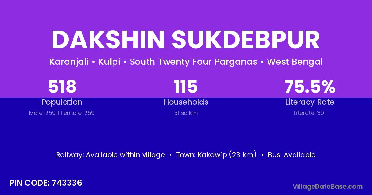 Dakshin Sukdebpur village has a total population of 518 people, of which 259 are males and 259 are females.