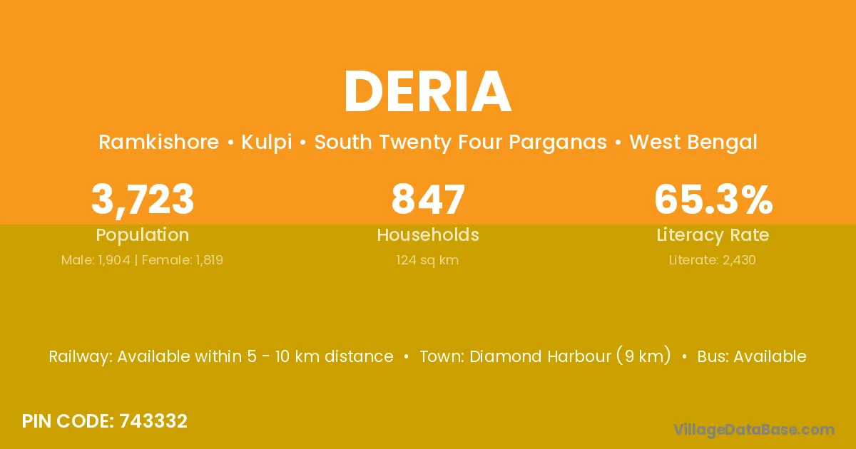 Diamond Harbour (9 km) is the nearest town to Deria village for major economic activities and is located approximately 9 km away.