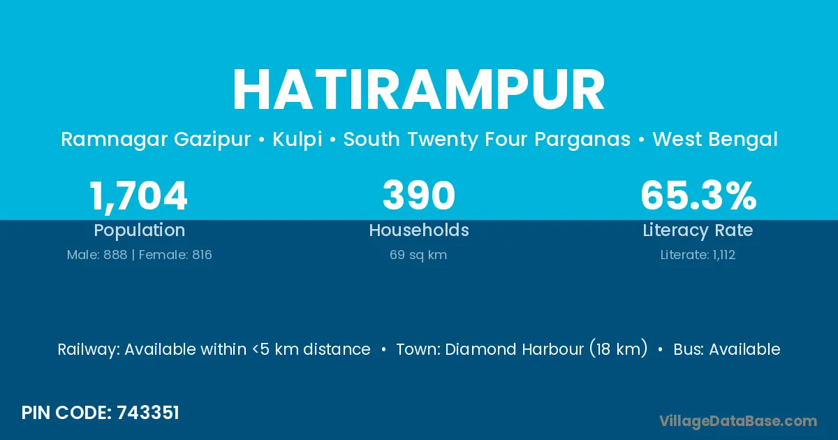 Diamond Harbour (18 km) is the nearest town to Hatirampur village for major economic activities and is located approximately 18 km away.