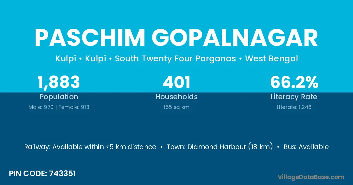 Diamond Harbour (18 km) is the nearest town to Paschim Gopalnagar village for major economic activities and is located approximately 18 km away.