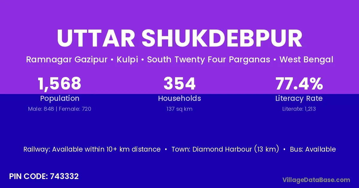 Uttar Shukdebpur village is located in the Kulpi Subdivision of the South Twenty Four Parganas district in West Bengal.
