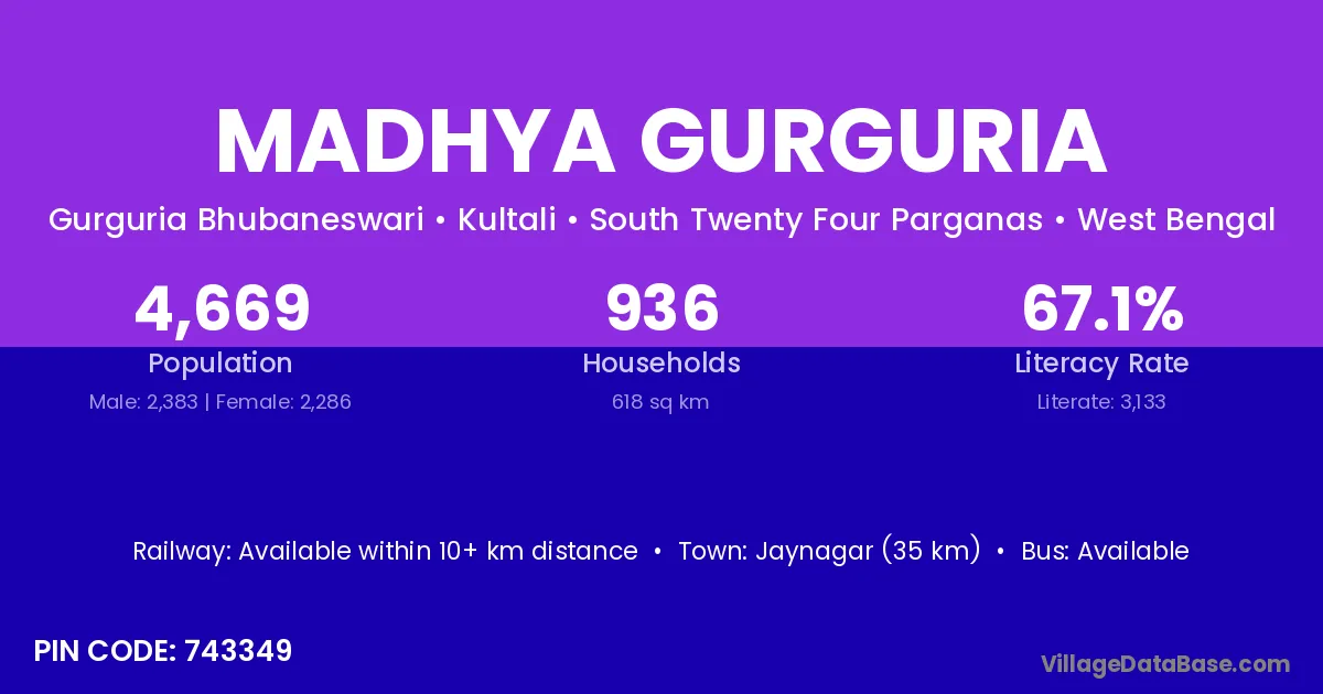 Madhya Gurguria village is located in the Kultali Subdivision of the South Twenty Four Parganas district in West Bengal.